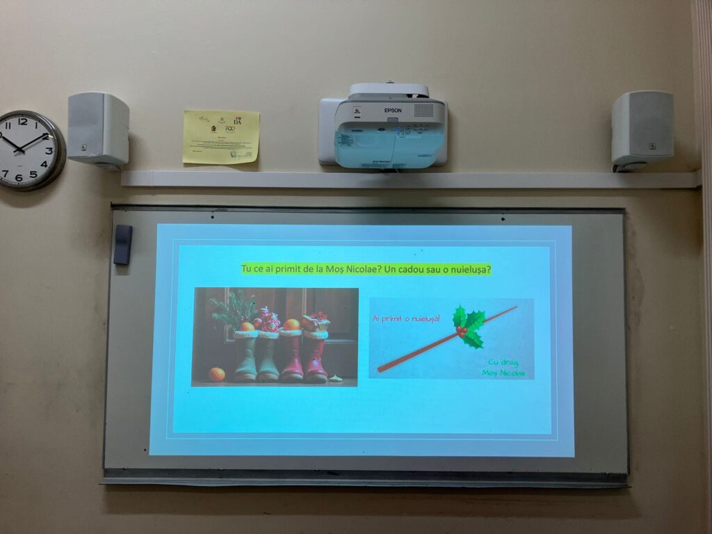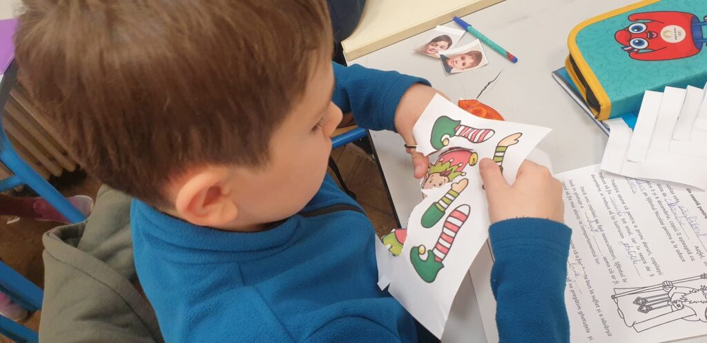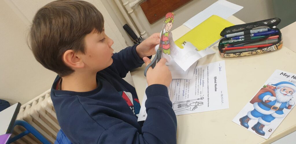 • Groupe 3-4 ans : Les enfants ont écouté une chanson joyeuse expliquant qui est Moș Nicolae et ce qu’il fait. Ils ont décoré méticuleusement la botte du Saint et ont appris à nettoyer leurs propres chaussures. Leur joie fut grande lorsqu’ils ont découvert, à leur retour dans le groupe, une surprise sucrée laissée par le Saint pour leur bonne conduite !