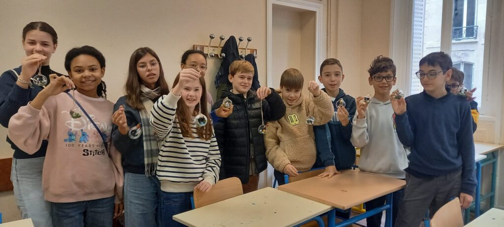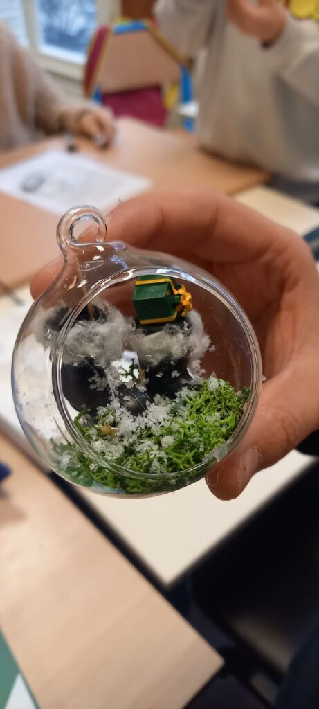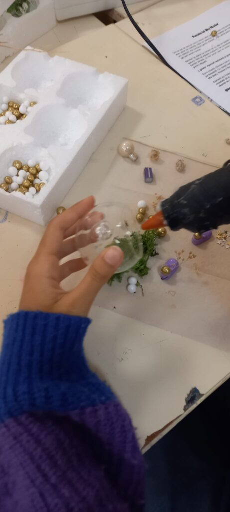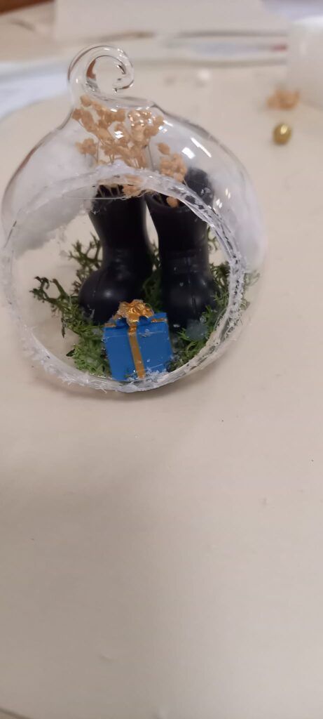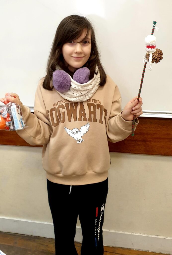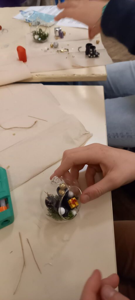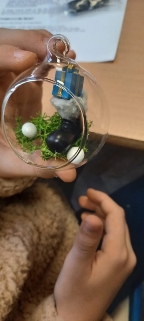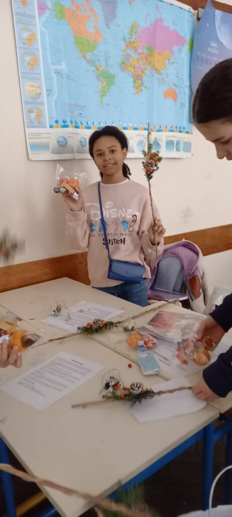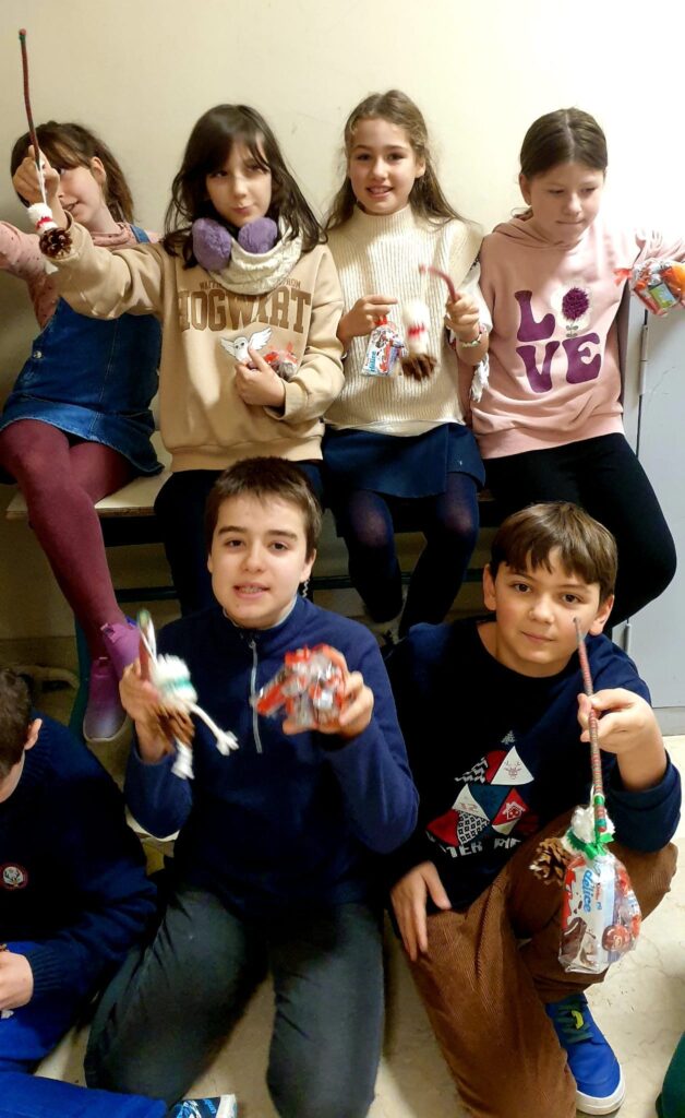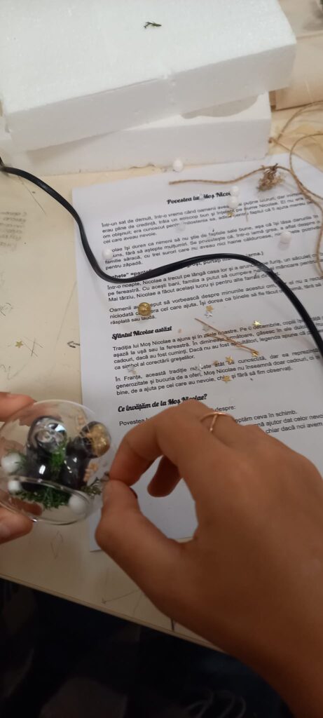 • Grand groupe 10-16 ans : Les élèves ont lu un texte sur Moș Nicolae, découvrant des termes tels que généreux et charitable. Ils ont fabriqué une boule pour le sapin qui capture le moment magique des bottes remplies de cadeaux – et, bien sûr, contenant aussi une petite tige symbolique. À la fin, Moș Nicolae leur a laissé, à eux aussi, une surprise sucrée aux côtés de la traditionnelle nuielușă, en guise de rappel qu’ils doivent rester sages.