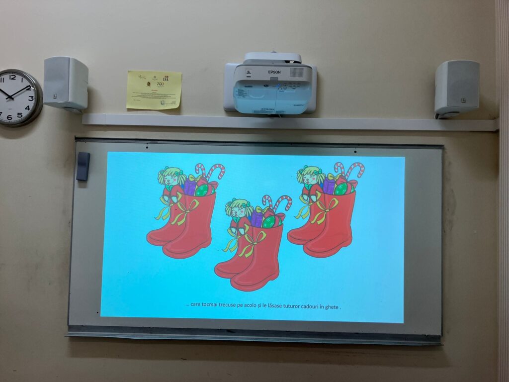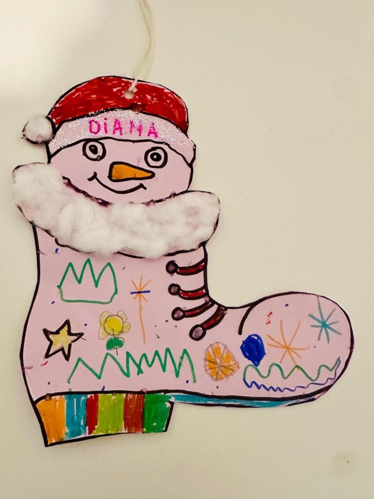 • Groupe 4-6 ans : Les petits ont écouté une belle version de la Légende de Moș Nicolae : un homme fortuné qui cachait son identité en s’habillant modestement et en laissant des cadeaux aux portes des nécessiteux, sans être vu. Ensuite, les enfants ont décoré les bottes du Saint et ont créé ensemble une merveilleuse histoire : « Moș Nicolae voyageait en hiver et a perdu, dans l’épais manteau de neige, une de ses bottes usées. Un petit bonhomme de neige a trouvé la botte et s’est exclamé : ‘Voilà une maison pour moi !’ Moș Nicolae a cherché la botte partout, et finalement, surprise ! La botte a été retrouvée… dans le sapin de Noël de la famille de Diana, ou dans les autres maisons des enfants du groupe. » L’histoire a captivé l’imagination des enfants, qui ont inventé leurs propres fins, pleines de créativité et de joie.