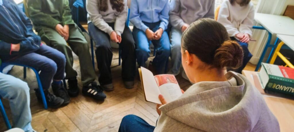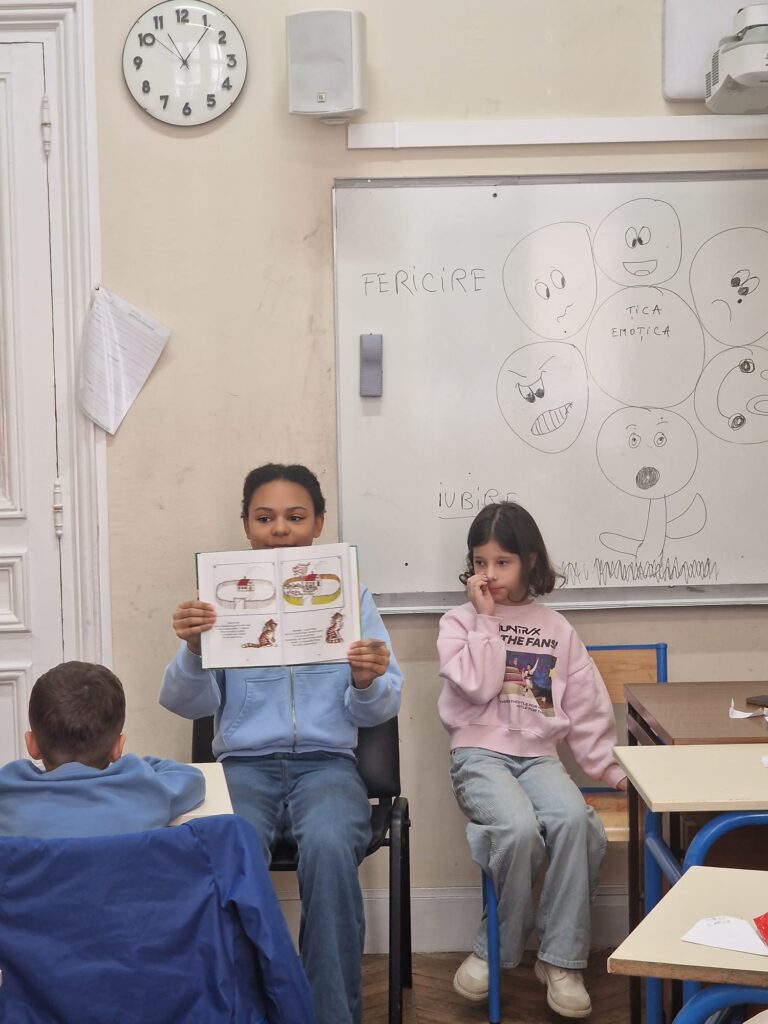 Les adolescents ont également participé à un cercle littéraire, au cours duquel ils ont lu des extraits de leurs livres préférés apportés de la maison, partageant leurs émotions et leurs découvertes avec leurs camarades. Ce moment a été suivi d’une lecture collective de « L’Histoire d’Apolodor » de Gellu Naum.